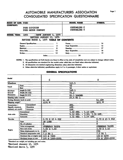 1954 Ford AMA Specification Sheets for Mainline-Customline-Crestline-Wagons -Revision